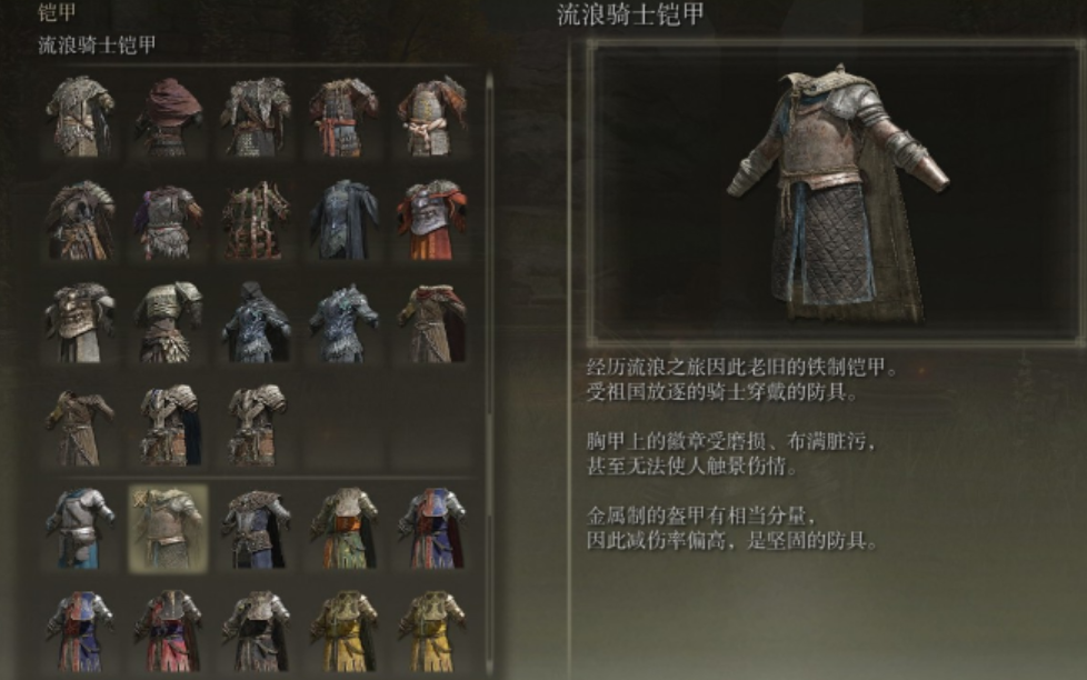 前期护甲套装推荐优先获取骑士套装,这套重型装甲能显著提升物理防御能力,虽然魔法防御增幅较小,但对于以近战为主的骑士职业已足够应对大部分物理系敌人。该套装可通过圆桌厅堂孪生老妪处购买获得,包含头盔、铠甲、臂甲和腿甲四个部件。若追求更高机动性,旅人之礼服可作为备选,其重量较轻能提升移动速度,但防御性能相对较弱。