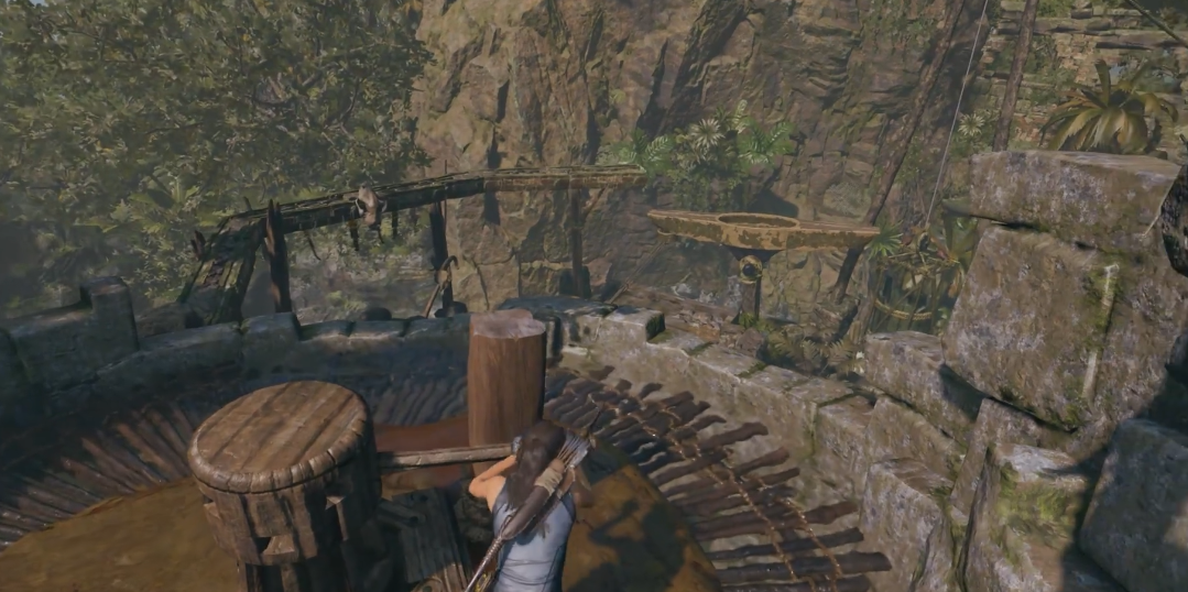 首先来到断桥前,咱们的小伙伴会提示需要上水塔顶开排气阀。沿着石轮后面的木梯爬上去,拉动开关让水塔工作起来。接着回到石轮处,和队友一起推动机关将水流导入绿色容器。这里要容器是漏水的,所以动作要快。石轮推到顶后会限时,必须立刻从右侧跳到下层,用绳索箭矢连接降下来的绳桩和对岸断桥上的绳桩。