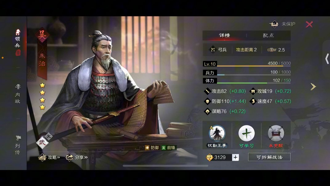 实战中,朱治适合开荒中期或攻城战使用。他的指挥战法不受控场影响,能稳定提供伤害或辅助效果,尤其在对抗高减伤队伍时表现突出。注意保护他的兵力,避免大营过早重伤。社稷坛建筑可提升名望上限,间接增强朱治的带兵能力,建议优先升级。