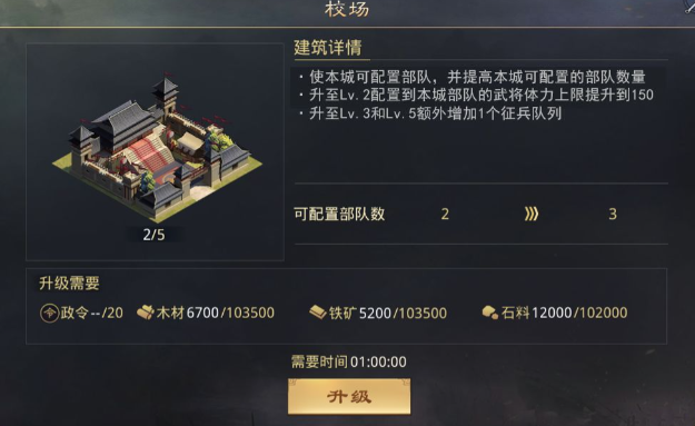 校场从3级升4级需要30分钟建造时间,可以用玉符立即完成。升级后能多配置一支部队,总共能带4队兵,这对后期打高级地和要塞非常关键。建议在能稳定打5级地后再考虑升级,这时候资源压力会小很多。注意校场4级是打4级要塞的前提条件,想快速开荒得规划好这个节奏。