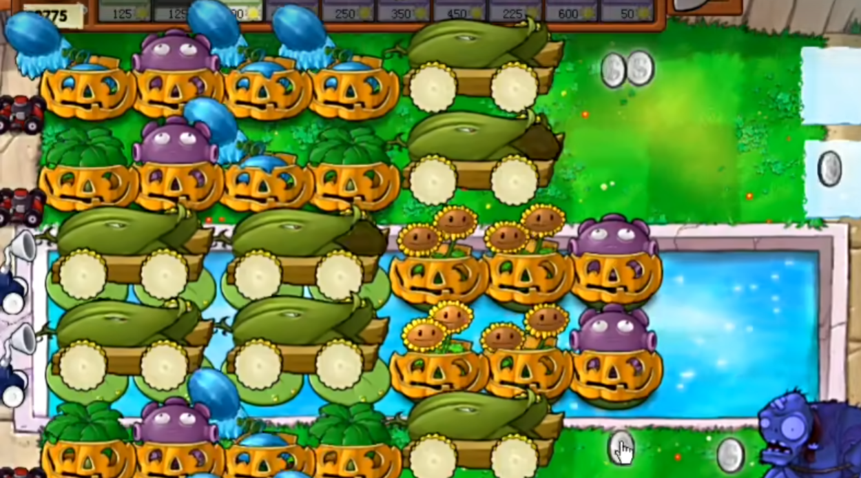 中期阶段需重点防范气球僵尸、矿工僵尸等特殊单位,建议在水路中后场补充三叶草或猫尾草应对空中威胁。陆地两侧需部署大喷菇或地刺王防止矿工偷袭,并开始筹备玉米加农炮的建造。阳光管理尤为关键,保留至少2000阳光用于紧急情况下的植物补充或能量豆使用。每波结束后需及时修补受损的南瓜套和地刺,避免防线因细节疏忽崩溃。