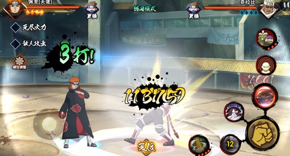 百战佩恩的黑棒机制是最大亮点,普攻掷出的黑棒会留在场上最多5根,与一二技能有联动效果。一技能万象天引会根据场上黑棒数量产生不同效果,5根黑棒时命中敌人会有特殊视觉表现。二技能神罗天征有三段强化,配合黑棒能延长抓取时间,5根黑棒时甚至能让对手在第三段伤害前无法替身。组合技地爆天星需要先释放三段神罗天征再点击万象天引触发。