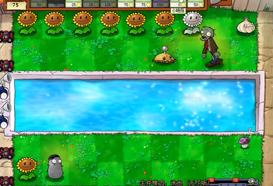 前期发育很重要,先种满两排向日葵保证阳光供应,遇到普通僵尸直接用土豆雷或窝瓜解决,别浪费火力。攒够阳光后优先把西瓜升级成冰西瓜,泳池区域最前排的冰西瓜效果最好,后排的可以晚点处理。记得在陆地带几个地刺王,专门对付冰车僵尸和矿工僵尸,地刺的持续伤害能有效拖延他们的进攻节奏。如果遇到气球僵尸,三叶草是性价比最高的选择,不用专门留卡槽给仙人掌。