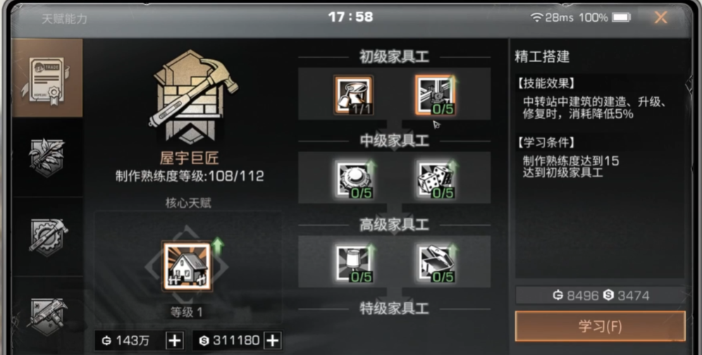优先点满高级肥料制作和幸运制造,后者在制作石砖、木板时概率额外产出,间接降低材料成本。精工搭建技能可减少中转站建筑消耗,但对赚钱无直接帮助。陷阱大师和灯饰制作技能实用性较低,除非服务器存在特殊装饰需求,否则不建议投入技能点。
