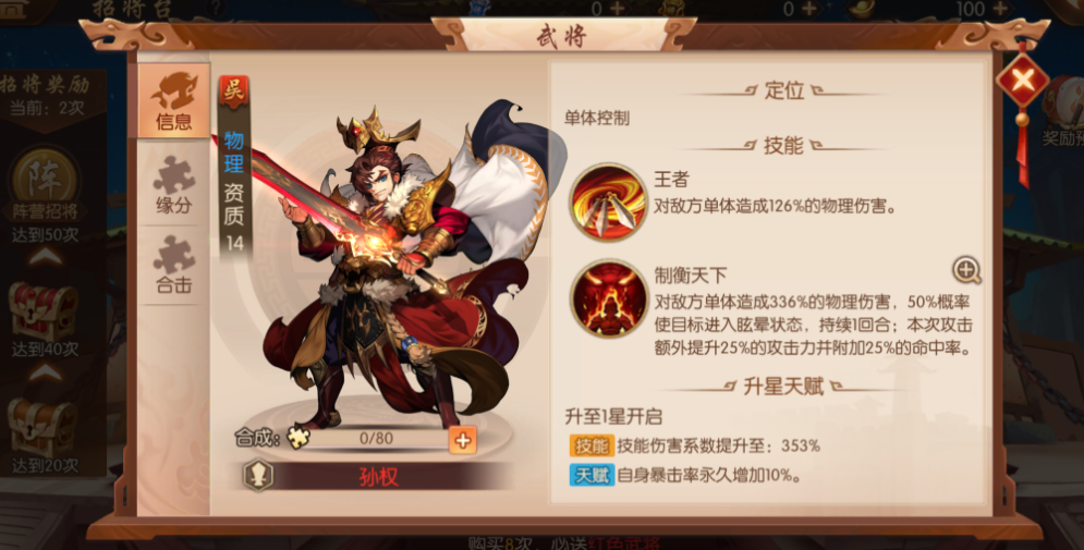 阵容搭配和站位是影响通关的关键因素之一,推荐将防御型武将放置在前排承受伤害,特别是针对吕布的攻击目标位置。例如在吴国阵容中,可以使用孙坚、孙权作为肉盾,而诸葛亮作为残血收割核心放在后排安全位置,大乔的治疗技能也要确保能覆盖到关键输出武将。如果三星通关失败,可以尝试调整肉盾武将的位置,比如放在阵亡的位置重新挑战,有时候简单的位置变动就能改变出手顺序和战斗效果。