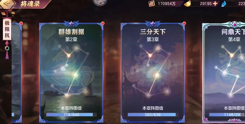 将魂系统在50级解锁后成为重要战力来源,通过天下试炼、名将试炼等途径收集将魂激活阵图属性。战魂套装需根据武将特性选择,暴击型武将适合爆裂冲击,防御型武将推荐连携加护。神兵系统通过赤壁试炼积累声望兑换,不同神兵附带独特技能效果,需与阵容战术相匹配。