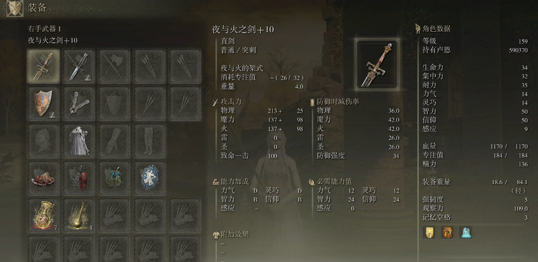 夜与火之剑的面板数值较高,物理、魔力与火属性三系混伤使其应对不同敌人时更具适应性。战技夜与火的架式中,魔力光炮射程远且伤害集中,适合对单体高血量目标;火焰斩范围广,可高效清理群体敌人。武器强化后战技伤害提升显著,尤其在智力与信仰属性达标时,光炮可造成多段高额伤害,火焰斩的削韧效果亦能压制多数敌人。