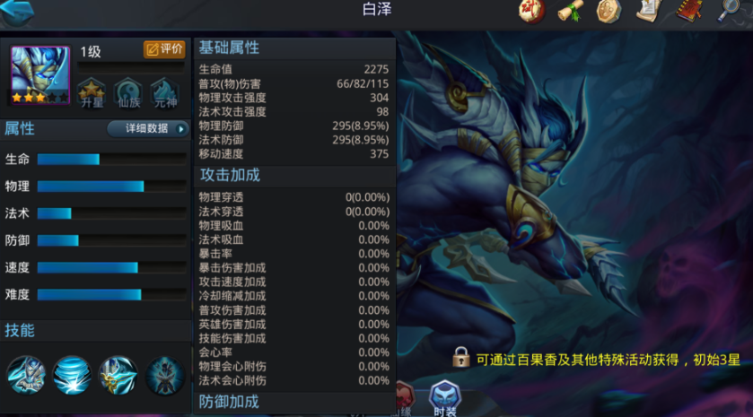 白泽是乱斗西游2中的一名仙族近战物理英雄,定位为刺客型角色。白泽以手持蓝色宝剑的形象登场,技能设计围绕突进、控制和爆发伤害展开。其核心机制依赖于跃起状态的技能联动,通过技能组合可打出高额连招伤害,同时具备一定的生存能力。从属性成长来看,白泽在灵巧属性上表现突出,但基础攻击强度相对中庸,需要通过装备和天赋补足输出短板。