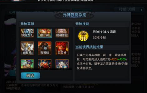 元神系统是提升英雄战力的重要玩法,合理搭配元神技能和属性可大幅增强队伍整体实力。元神达到五重景宵境·初后开启元神技能功能,玩家可将一名符合条件的英雄放入元神中,系统自动指定其一个技能作为元神技能,战阵中的所有英雄均可使用该技能,但共享冷却时间。召唤出的元神英雄会释放指定技能后离场,其伤害或治疗效果仅与元神属性相关,与英雄自身无关。选择元神英雄需满足不在战阵中、等级70级、星级5星、飞升7级的条件。