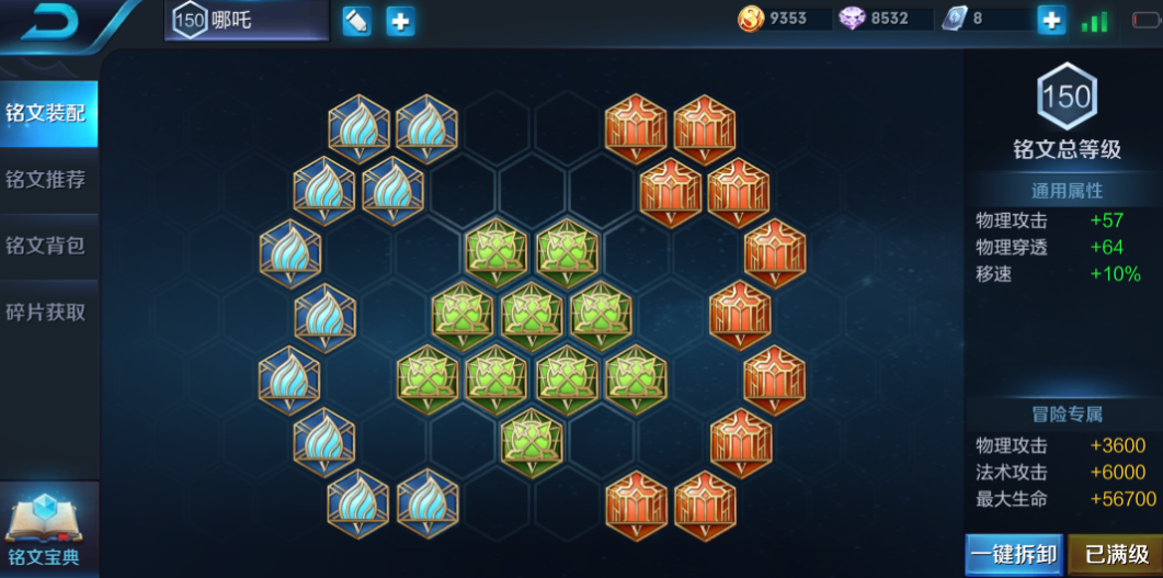 它的核心思路不是靠物理攻击打伤害而是依靠痛苦面具这类装备的被动效果,配合哪吒技能自带的持续灼烧,对敌人造成基于最大生命值的法术伤害。出装通常会以红莲斗篷和痛苦面具为核心,之后再补一些同时提供法术强度和生存能力的装备,比如时之预言或者冰霜法杖。但这种玩法毕竟不是主流,哪吒的技能加成主要还是物理攻击,所以法装收益没那么高,而且自身会非常脆,只适合在特定阵容或者娱乐局里尝试一下,新手玩家了解一下就好,不推荐作为主要的上分手段。铭文方面通用的思路是增加生存能力和一定的输出。红色可以带宿命,增加攻速、生命和物理防御;绿色带虚空,提升生命和冷却缩减;蓝色带隐匿,增加物理攻击和移速。
