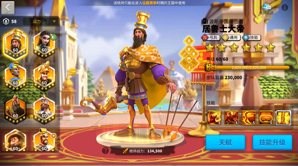 居鲁士大帝是游戏中的第四代弓兵传说统帅,定位清晰,专精于率领弓兵部队作战。他的主动技能长生军能对单一目标造成高额伤害,并在短时间内使目标受到的伤害增加,这个增伤效果对于集火单个目标时非常有效,是他在集结进攻中的核心手段。他所率领的弓兵部队会获得移速和攻击力的永久提升,这赋予了队伍出色的机动性和伤害基础,让弓兵能在战场上更灵活地走位与输出。