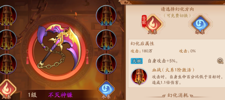 紫金装备幻化成功后会开启水火两条强化路线供你选择,火系幻化效果更偏向于增强进攻和爆发伤害,水系幻化则侧重于提升生存与防御能力,每条路线都会赋予装备强力的被动技能,幻化阶数的提升还会直接增加百分比属性,配合高阶精炼能带来巨大的战力飞跃。