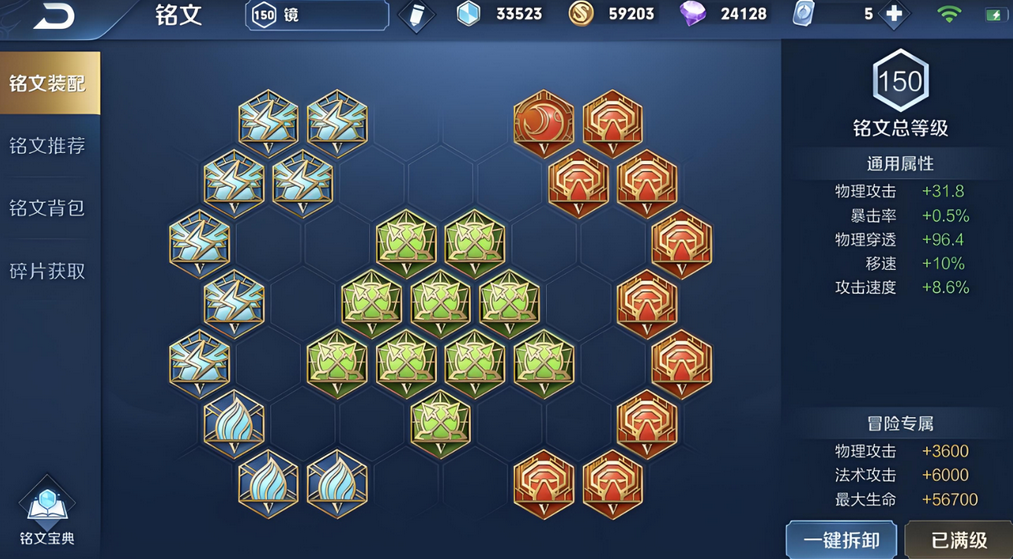 这套铭文兼顾物理穿透、攻速阈值与移速加成,100点基础物理穿透让前期刷野与抓人伤害更扎实,少量攻速优化技能衔接普攻的流畅度,移速属性配合上墙机制大幅提升转线与追击效率,完全适配暃灵活突袭的定位,避免纯百穿铭文手感僵硬的问题,无论是野区缠斗还是越墙开团都能保持输出连贯性。