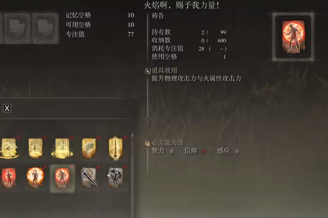 信仰流派前期需重点收集关键祷告技能。火焰赐予力量可提升攻击力,野兽活力则增强生存能力,这两项基础祷告在宁姆格福区域即可获取。对于远程输出,雷电枪与黑焰构成主要伤害手段,前者出手快且耗蓝低,后者附带百分比伤害效果。部分祷告如黄金树恩惠需要完成特定NPC任务链,前期可暂缓获取,优先强化基础战斗体系。